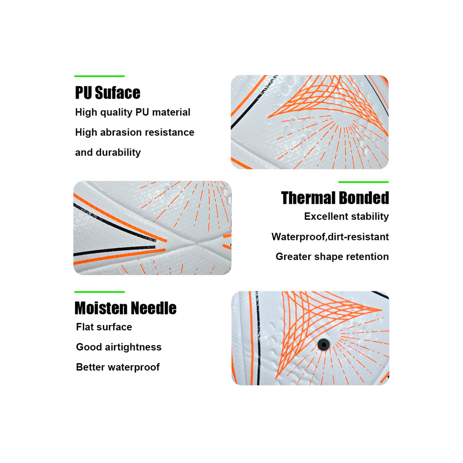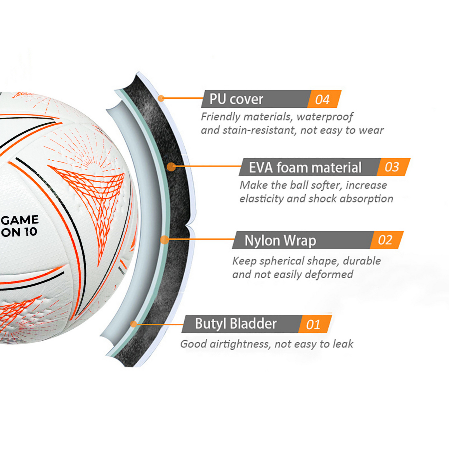 This soccer ball combines high-quality materials and innovative design to deliver exceptional performance. Its PU cover, EVA foam, and durable nylon wrap ensure a professional-grade experience for all players. Perfect for training and matches alike.