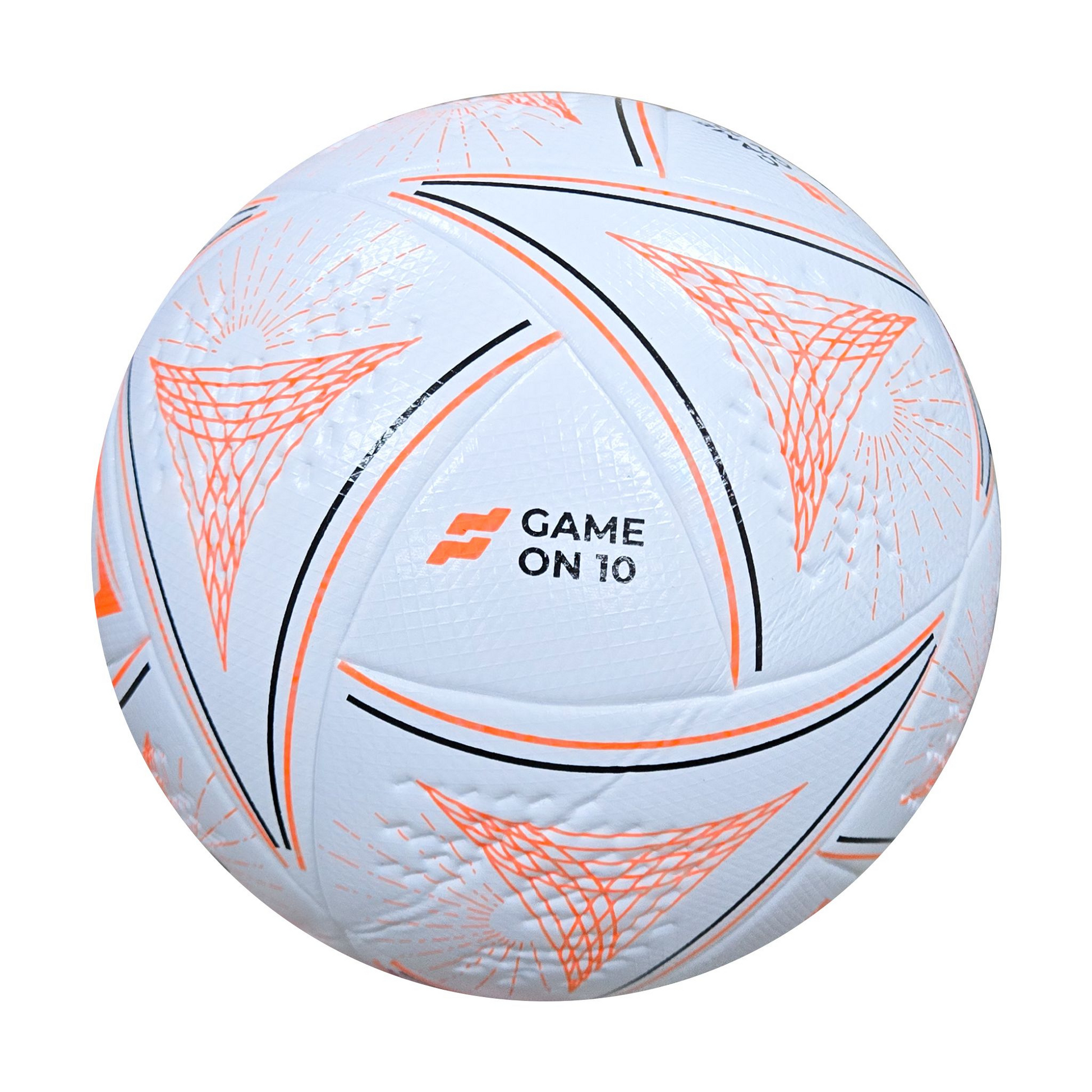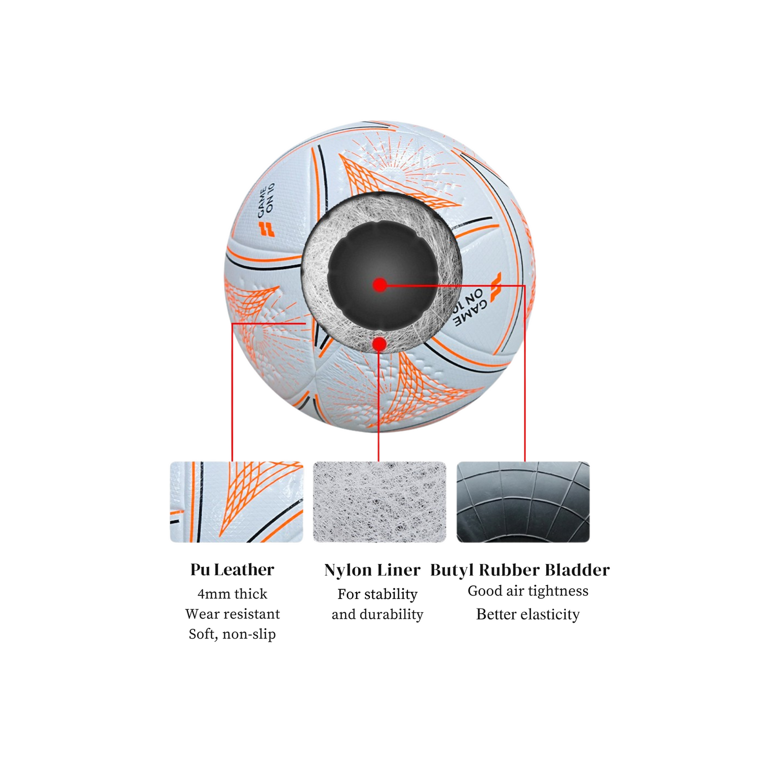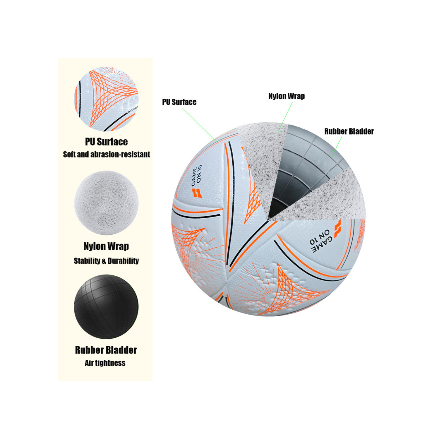 Crafted with precision, this soccer ball features a soft PU surface, a stable nylon wrap, and a robust rubber bladder for maximum durability. Built to maintain its performance across all surfaces and weather conditions.